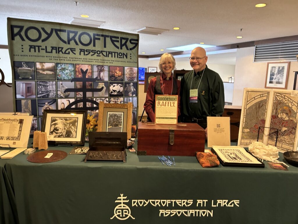 Roycrofters-At-Large-Association members Laura Wilder (Master Printmaker) and Bob Thompson share information and welcome new supporters at the 38th National Arts and Crafts Conference in Asheville, NC.